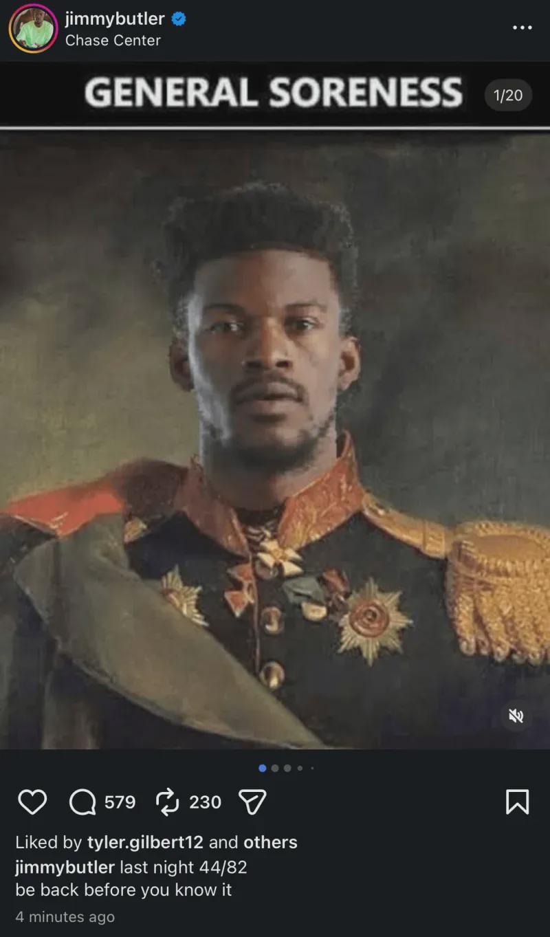 赛季报销后,巴特勒心情竟然还不错,在社媒上晒出一张久远的梗图: